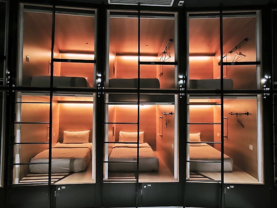 This is a single pod in an air-conditioned mix dormitory room. Guests have access to the shared bathroom.